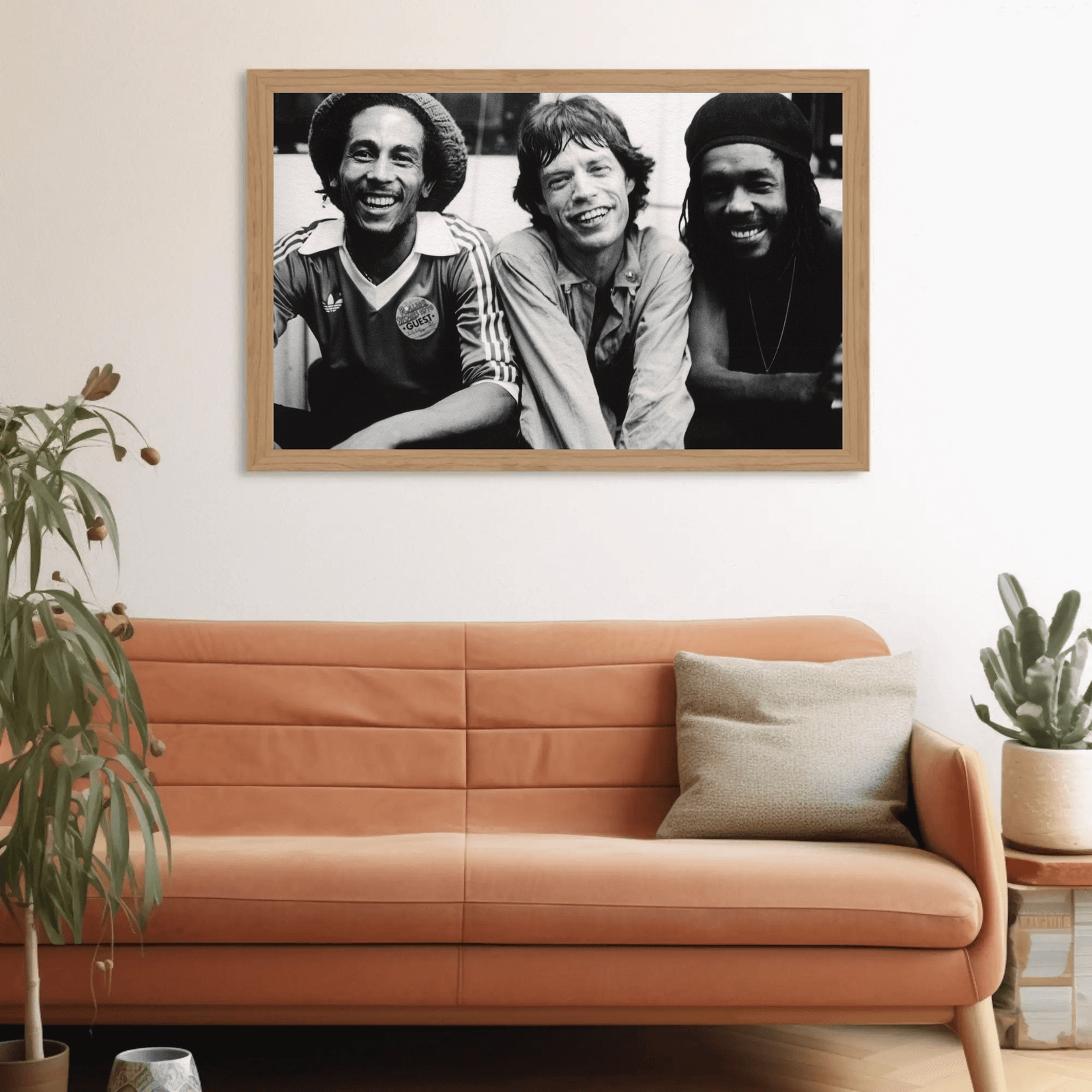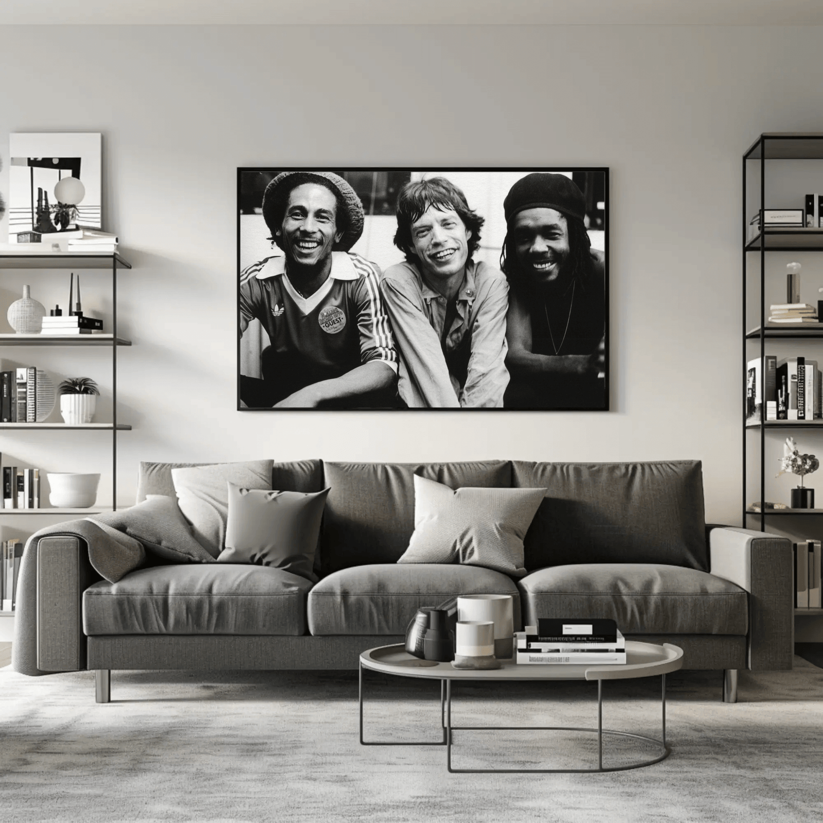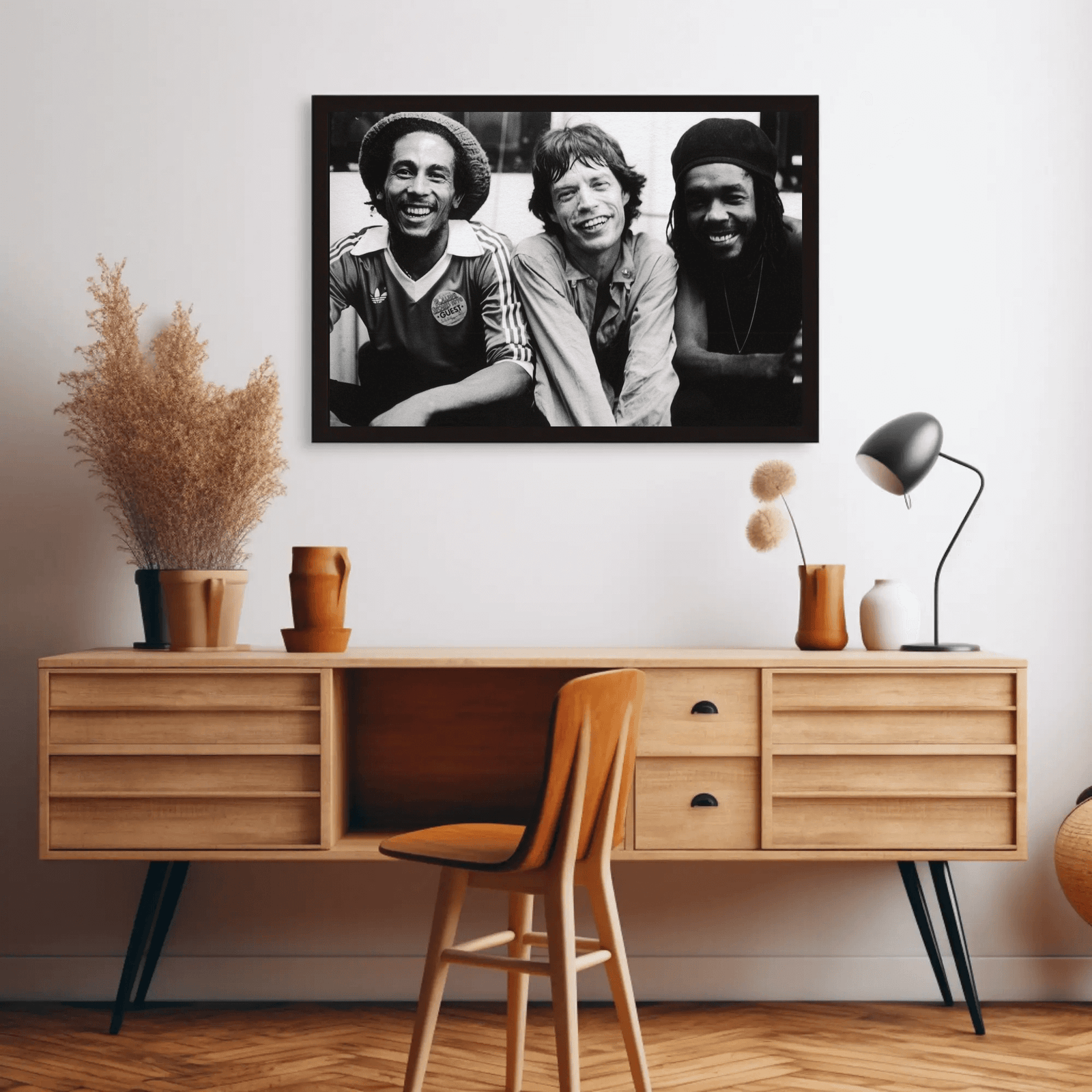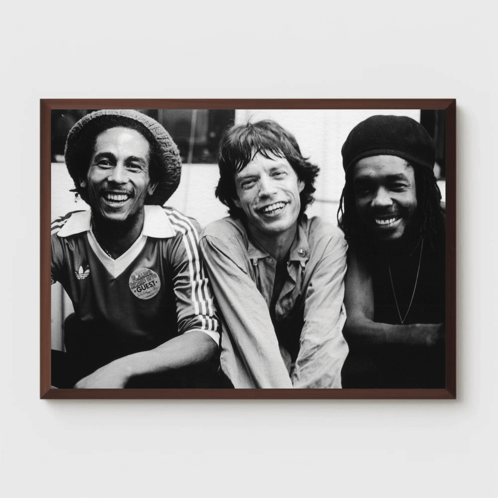 A striking black and white portrait capturing the rare, powerful moment between reggae icon Bob Marley and rock legend Mick Jagger. The image exudes musical synergy, charisma, and timeless cool. Perfect for lovers of music history and bold, minimalist decor.