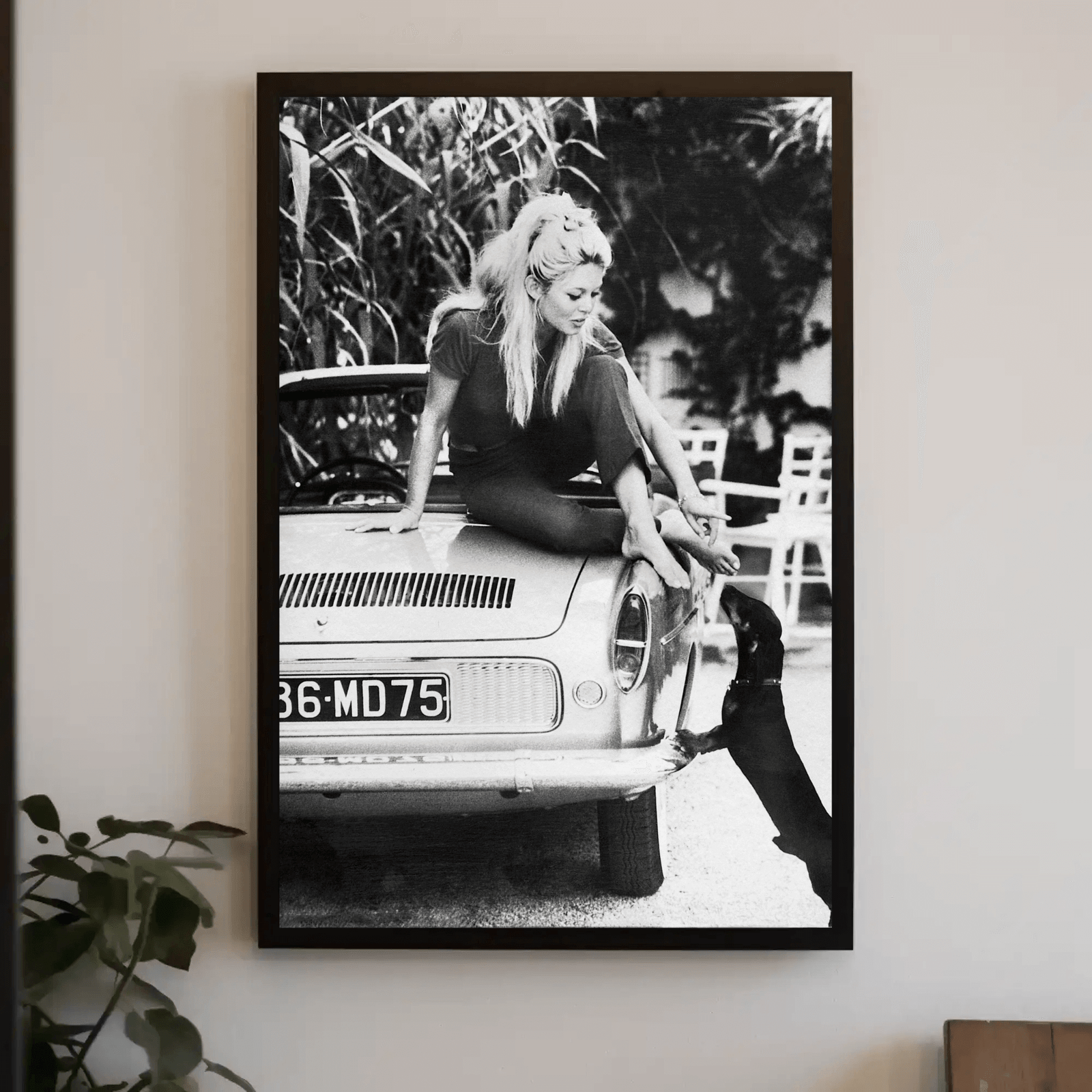 An elegant black and white photograph exuding effortless sophistication and Parisian charm. This striking image captures icon Brigitte Bardot sitting on a car, stretching down towards a dog. Perfect for adding character to bedrooms, dressing areas, or modern living spaces, this piece celebrates beauty, confidence, and the golden age of cinema in a refined, tasteful way.