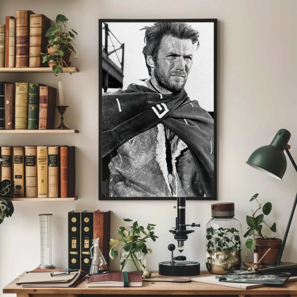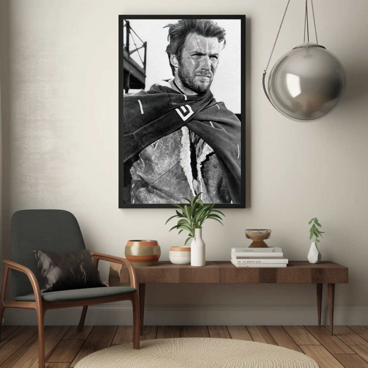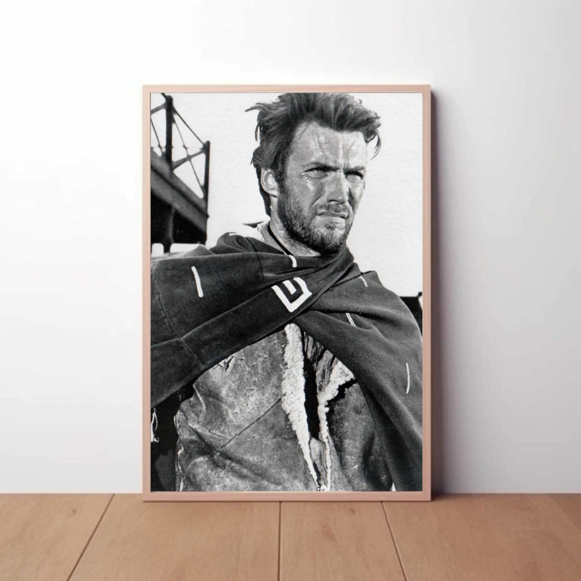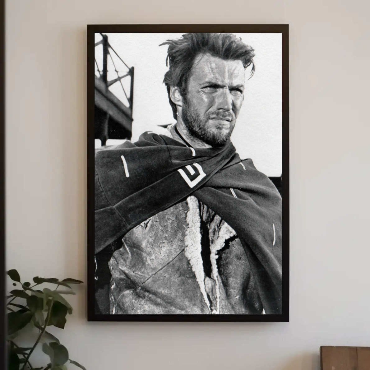 A classic black-and-white portrait of Clint Eastwood in his most legendary role. Wrapped in a rugged poncho with a steely gaze, this image captures the essence of the iconic gunslinger from the Spaghetti Western era. A must-have piece for cinema enthusiasts and collectors of timeless film art.