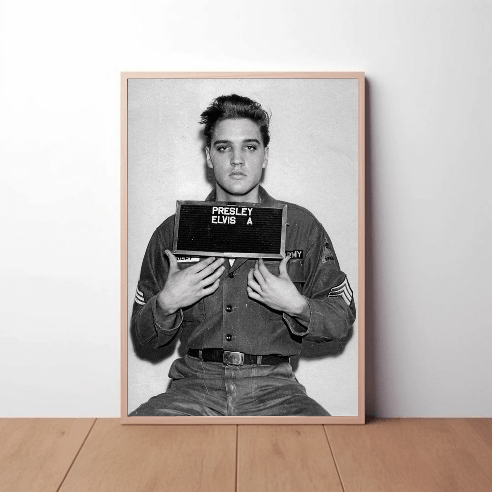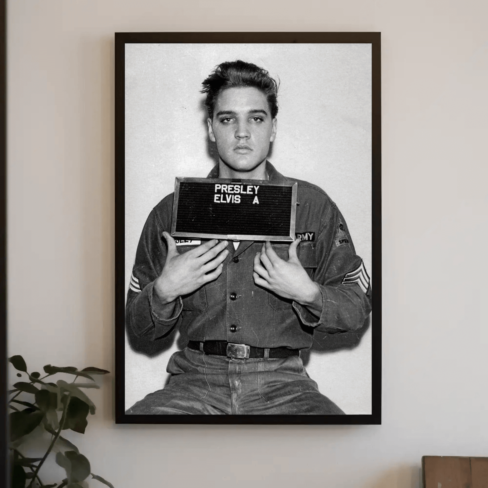 A striking black and white portrait capturing Elvis Presley in a mugshot, bold and undeniably memorable. The high contrast and minimal composition highlight his features and iconic presence. A powerful statement piece for music fans, collectors, or anyone wanting a timeless rock ’n’ roll aesthetic.