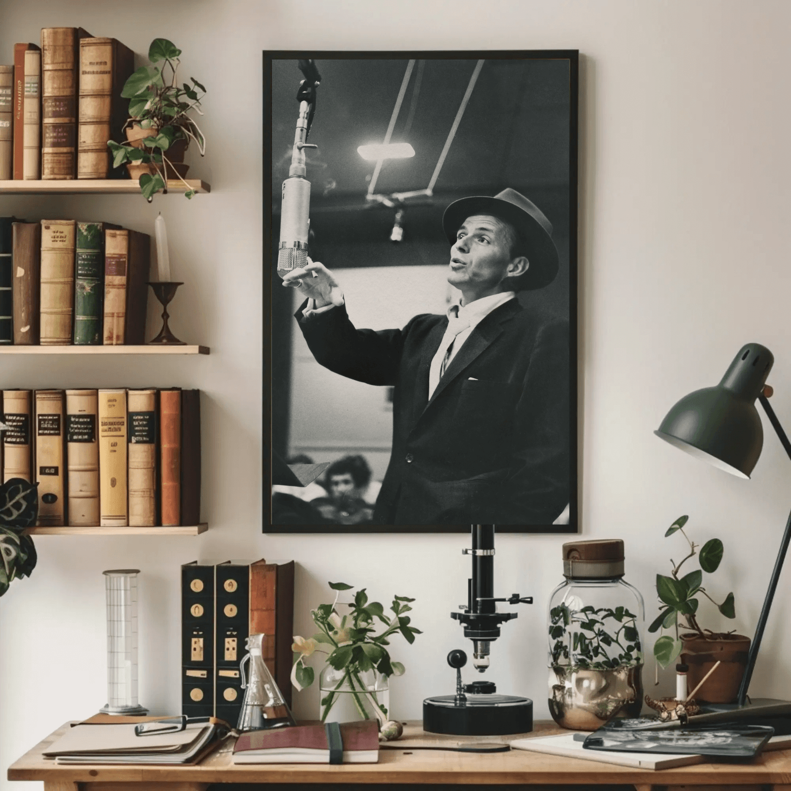 A captivating black and white portrait capturing Frank Sinatra in his creative element inside Capitol Studios. The image radiates focus, artistry, and vintage glamour a timeless glimpse into the golden age of music. With its deep tones and cinematic atmosphere, this piece adds sophistication and cultural depth to any modern space, perfect for lovers of style, sound, and classic cool.