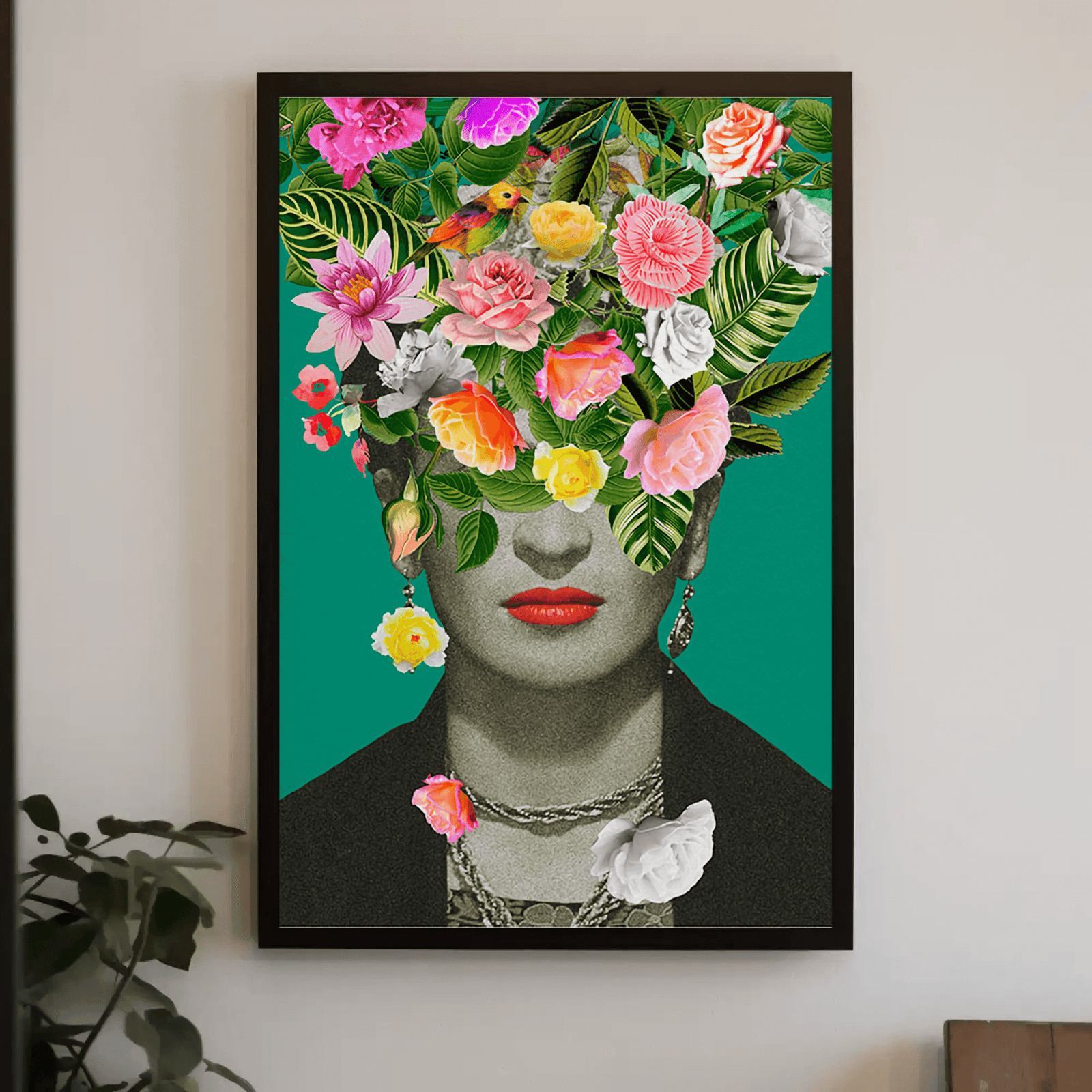 A captivating Graphic print of renowned artist Frida Kahlo with red lips and flowers covering her face on a green background. Perfect for interiors that value creativity, culture, and timeless femininity, this artwork brings both edge and elegance to any modern wall.This bold and colourful design is a perfect fit for the home of a maximalist