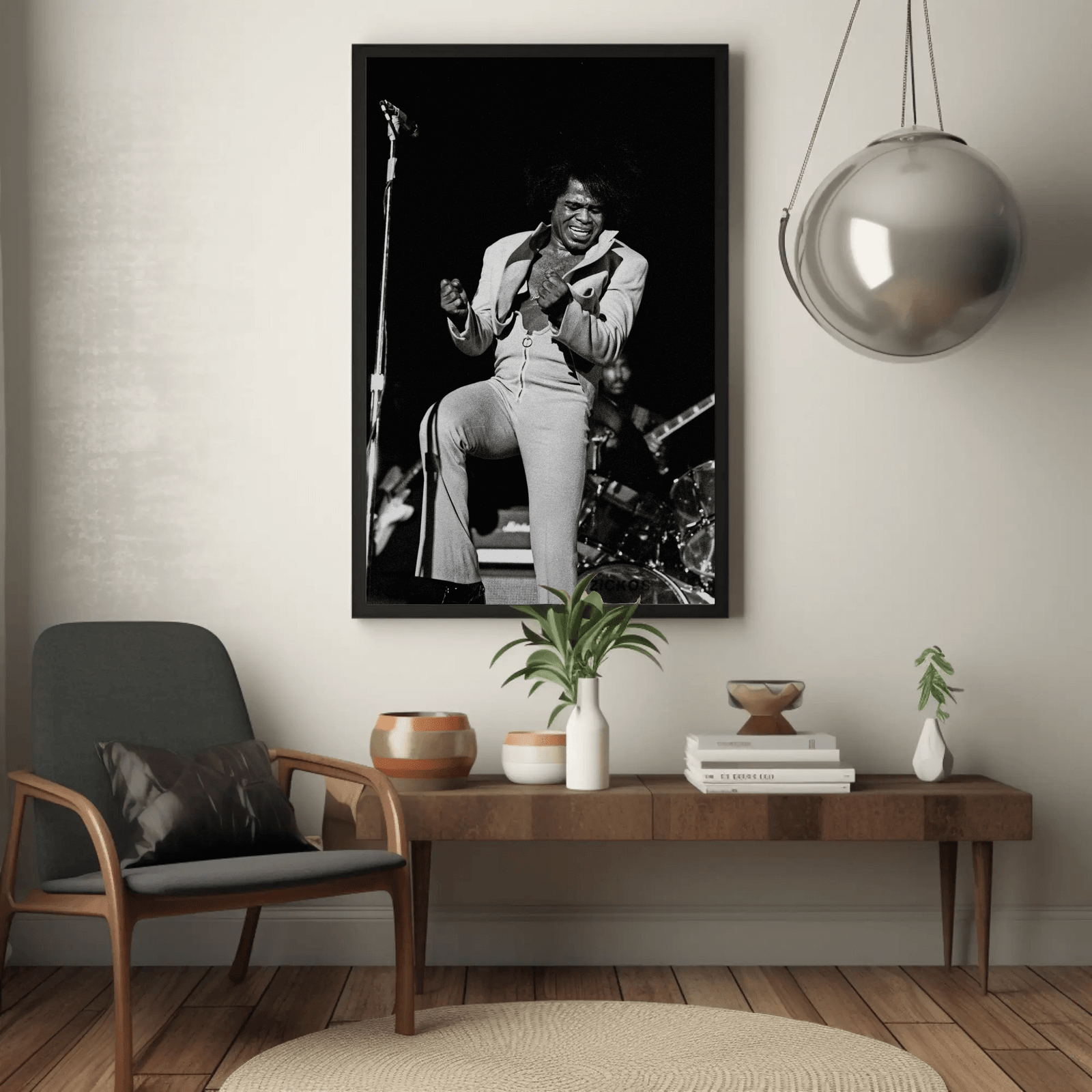 An intense black and white image of James Brown from 1973, full of soul and dynamism. The high contrast and expressive pose channel energy and raw passion, capturing the Godfather of Soul in his element. A striking piece for lovers of classic music, retro vibe, and powerful imagery.