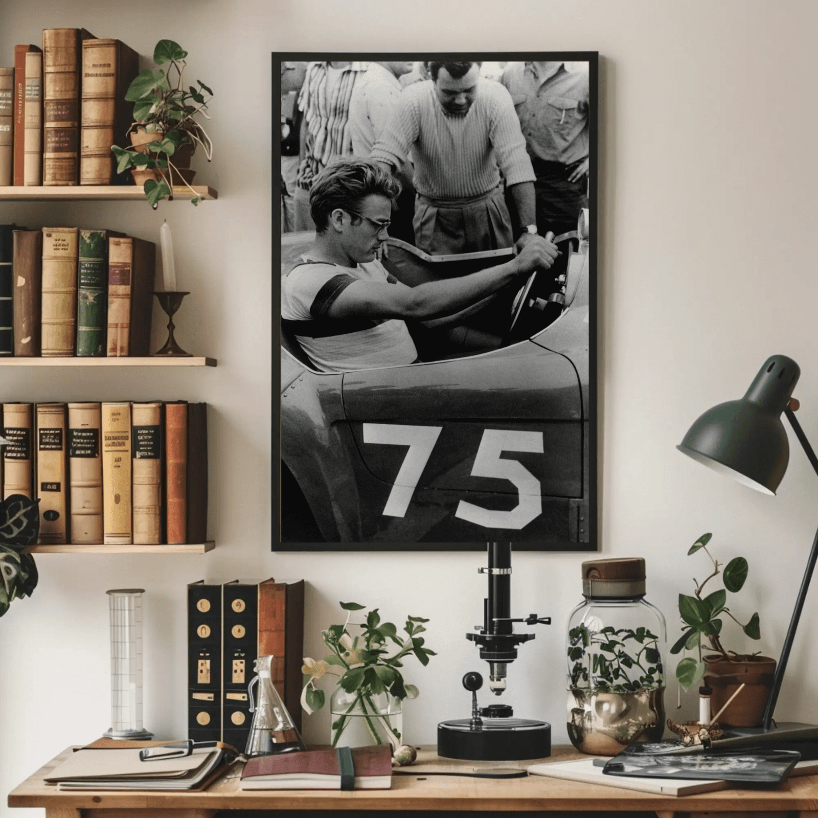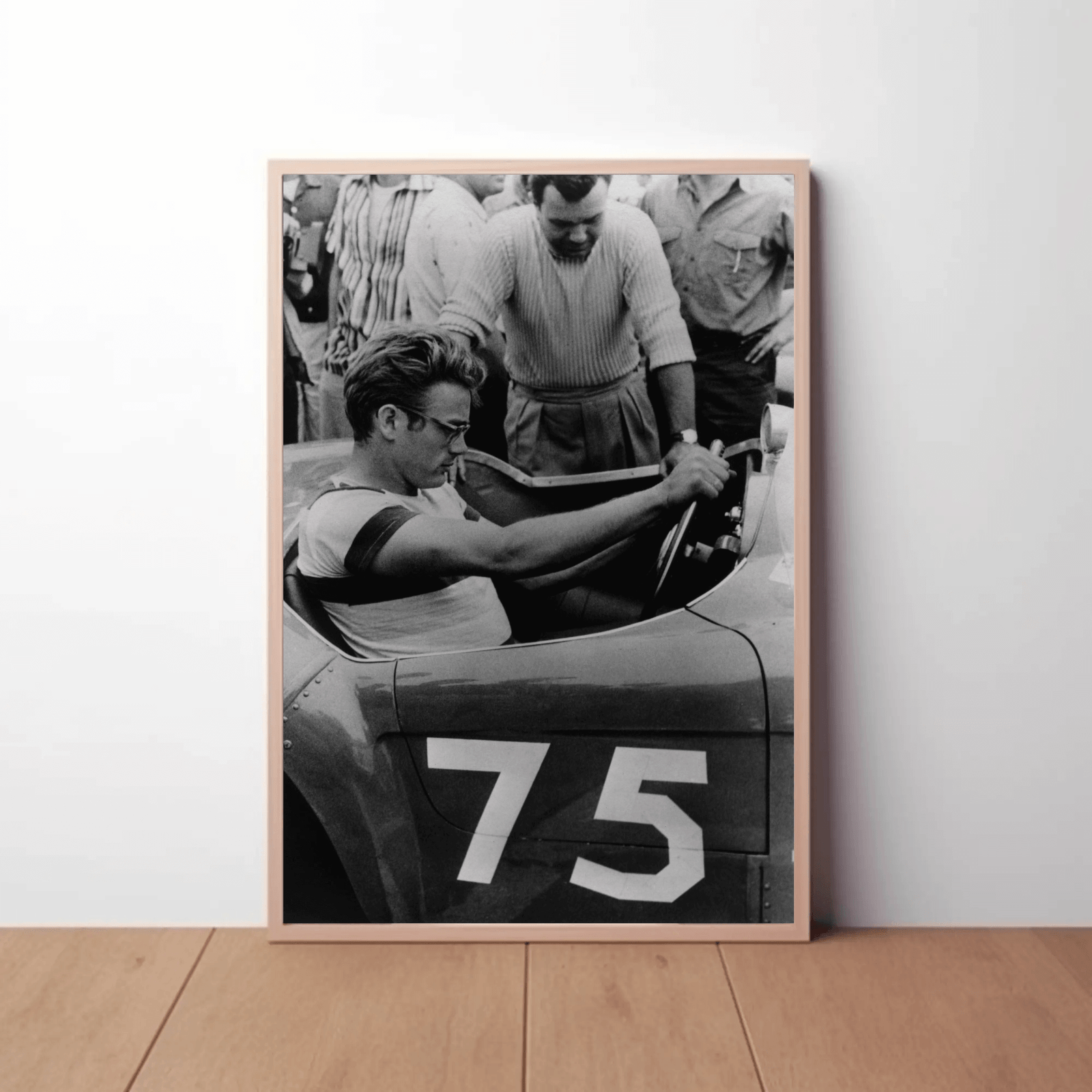 A dramatic black and white portrait of James Dean behind the wheel, exuding cool rebellion and restless energy. The contrast captures his intense expression and the motion implied by the car, making this image both nostalgic and cinematic. A standout piece for fans of classic Hollywood, vintage cool, or those drawn to icons of youthful defiance.