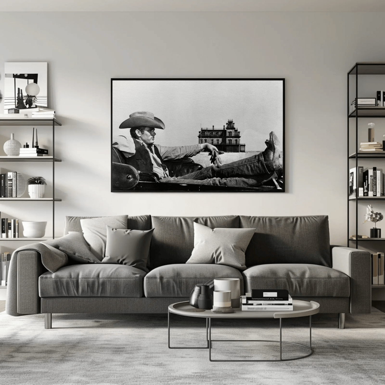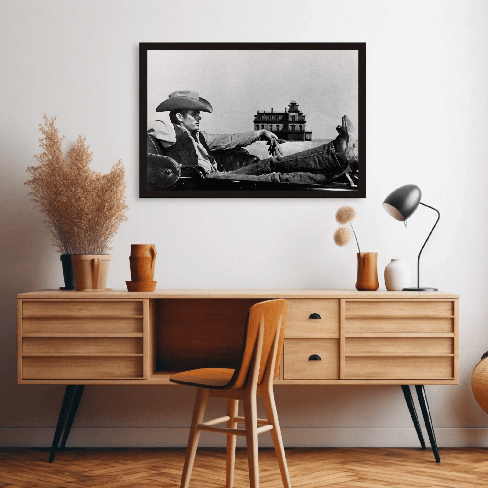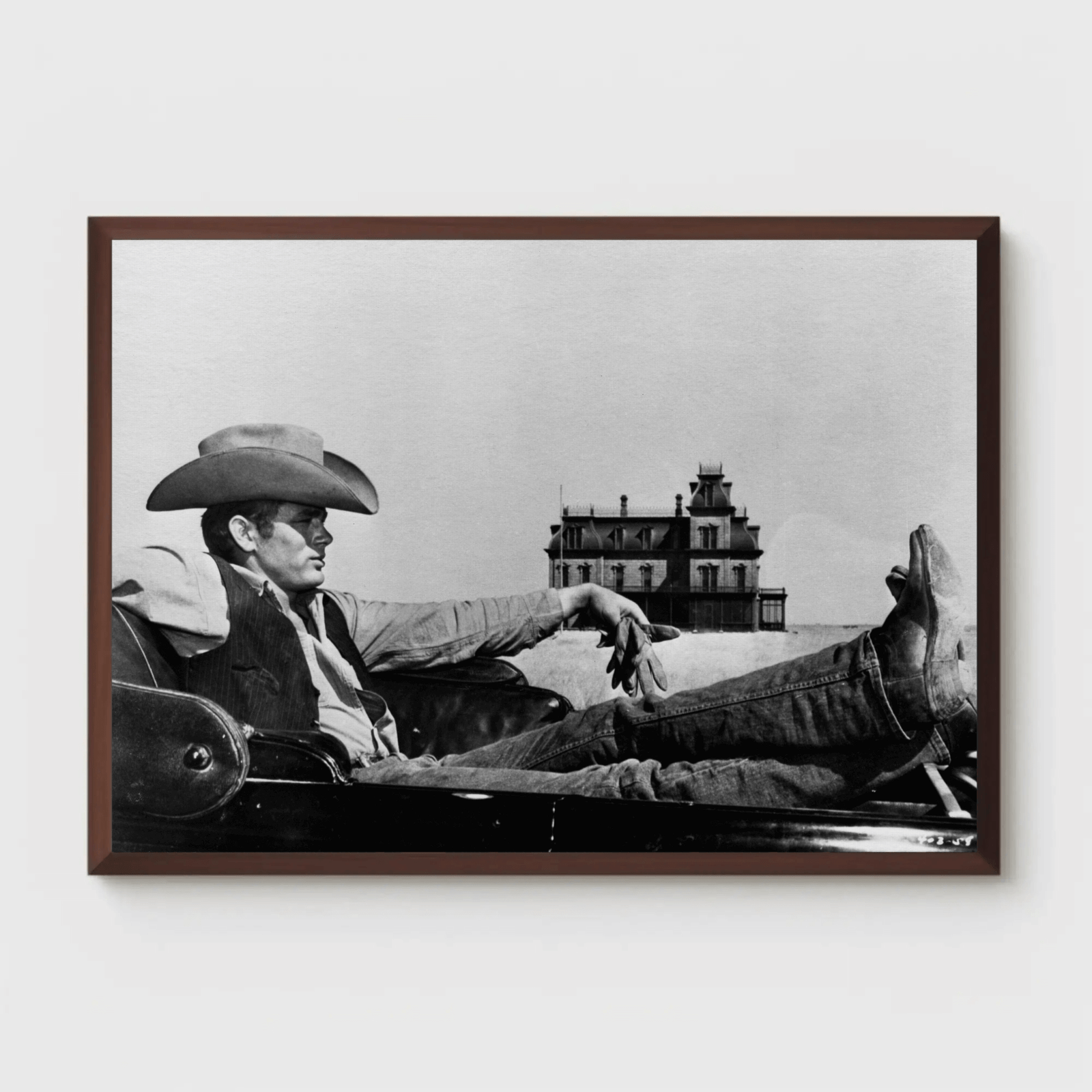 A powerful monochrome image of James Dean in Western garb, blending his iconic rebel persona with rugged, frontier character. The high contrast lighting accentuates textures and shadows, giving the portrait depth and cinematic tension. A striking addition to film art collections or interiors that celebrate timeless icons with edge.