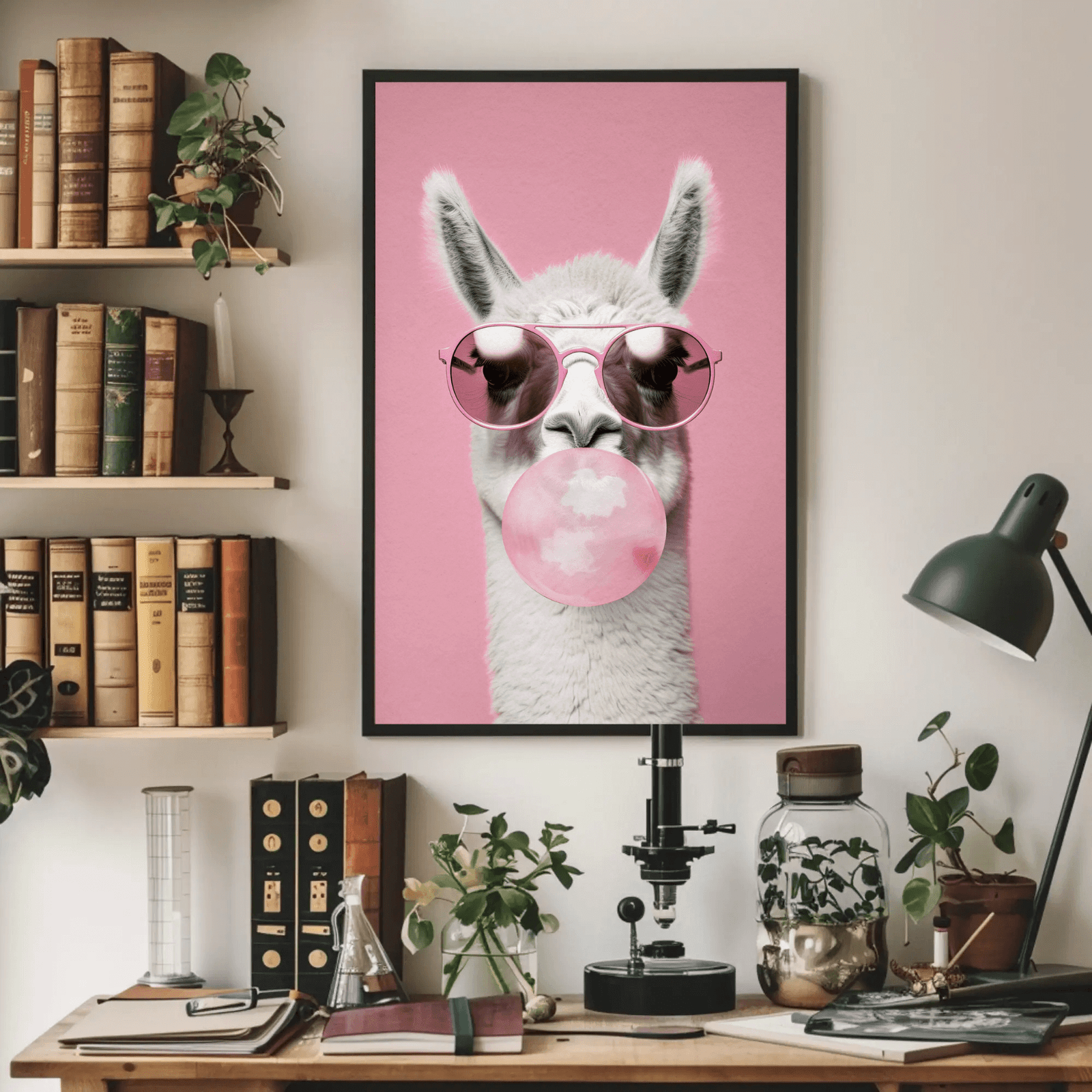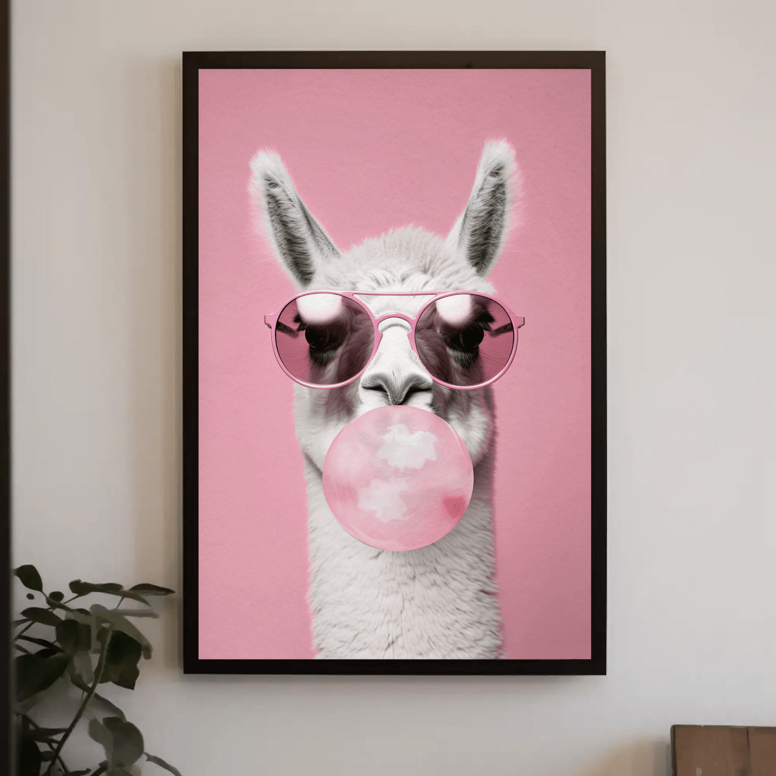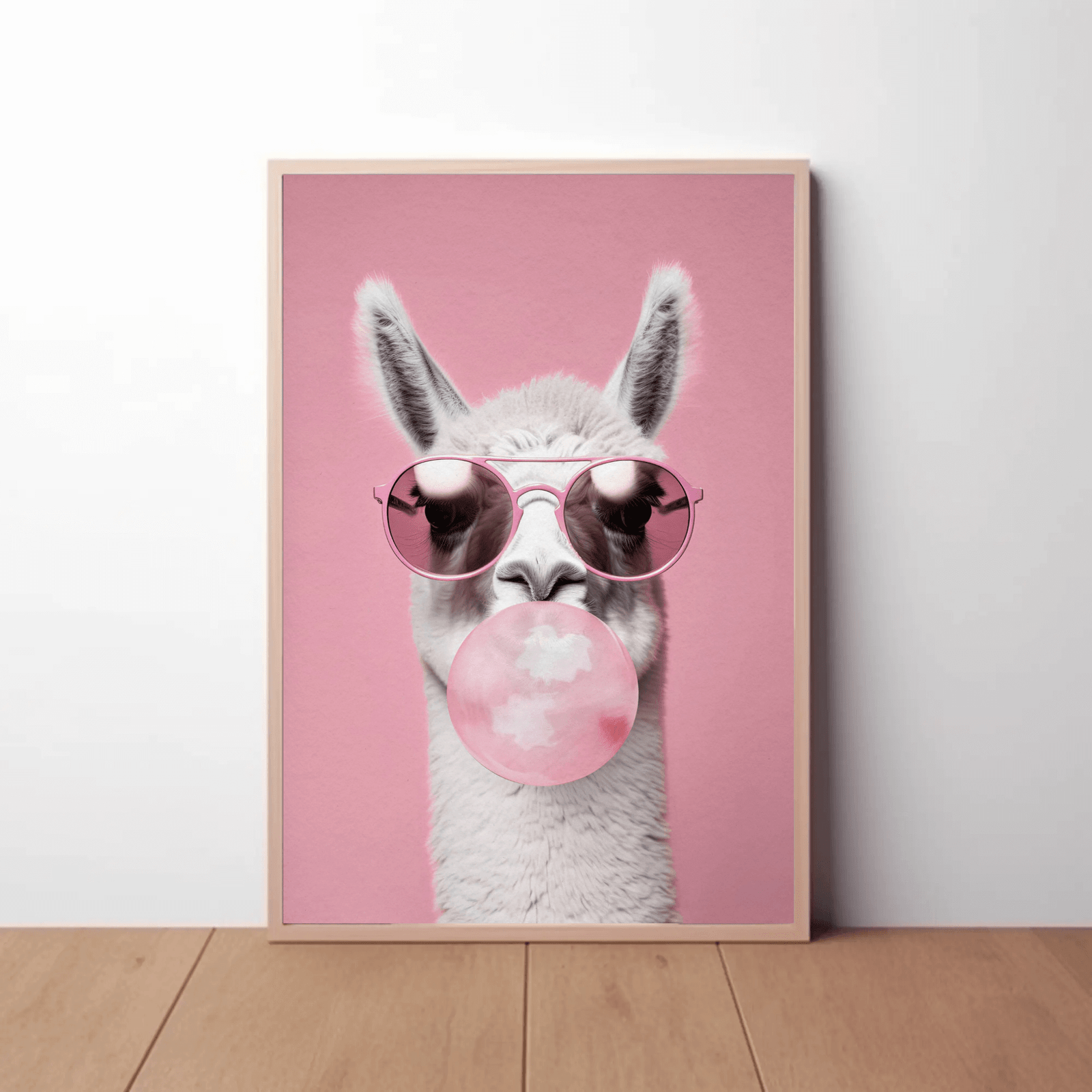 A delightful illustration of a stylish llama wearing pink sunglasses and blowing bubblegum against a cheerful pink background. Playful and charming, this whimsical piece is perfect for children’s rooms, playrooms, or anyone who loves fun animal art with personality.