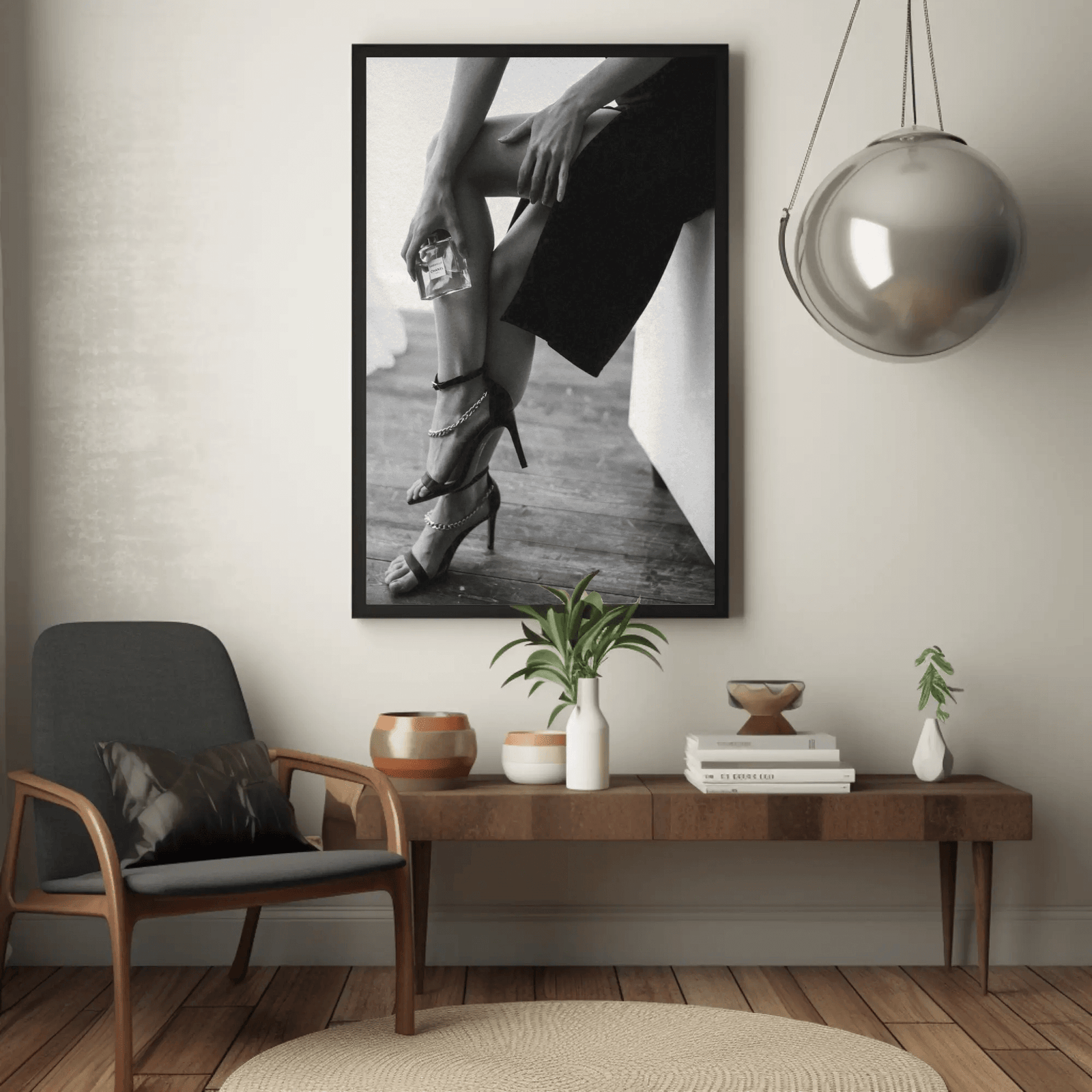 An elegant black and white art print capturing luxury heels beside a classic perfume bottle a portrait of timeless femininity and refined glamour. This cinematic composition evokes the allure of haute couture, sophistication, and Parisian elegance. Perfect for chic interiors seeking a statement of style and grace.
