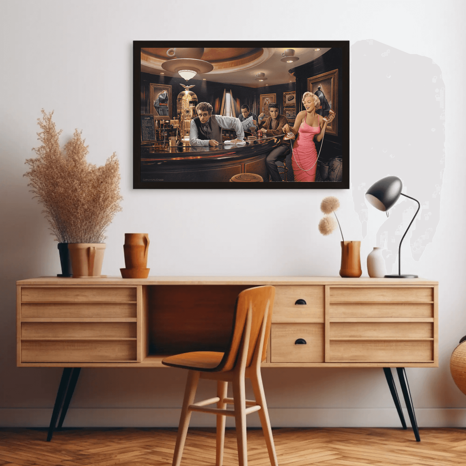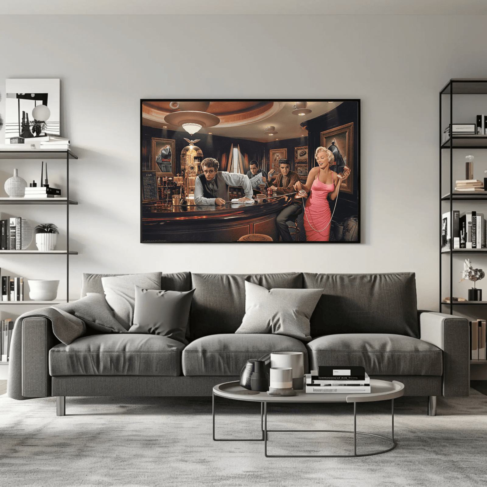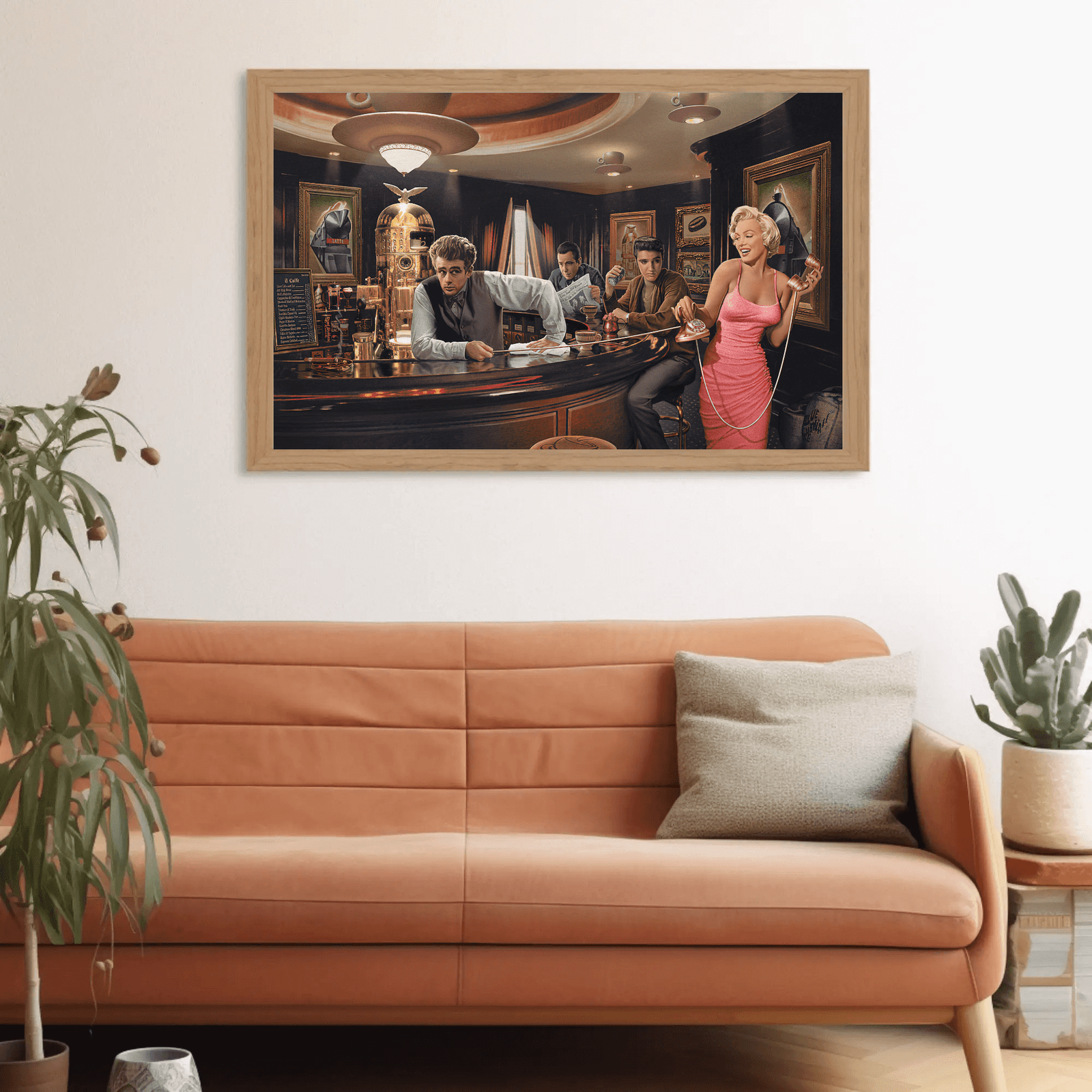 A vibrant illustrated scene capturing the essence of 1950s cafe culture with iconic figures gathered in an elegant establishment. Featuring rich colors, period details, and glamorous styling, this nostalgic artwork celebrates the golden age of American diners and Hollywood charm. Perfect for kitchens, dining rooms, or anyone who loves retro Americana and vintage pop culture art.