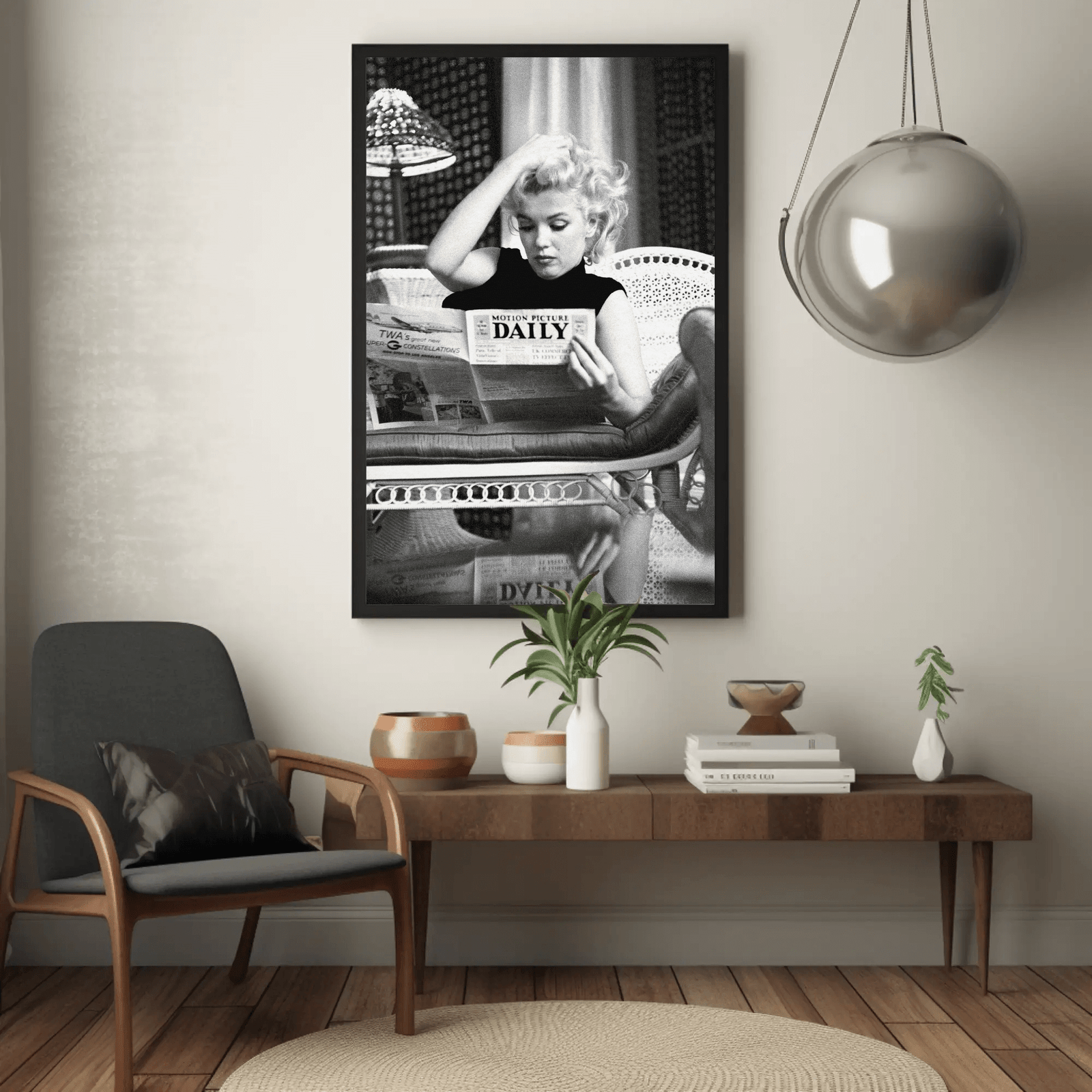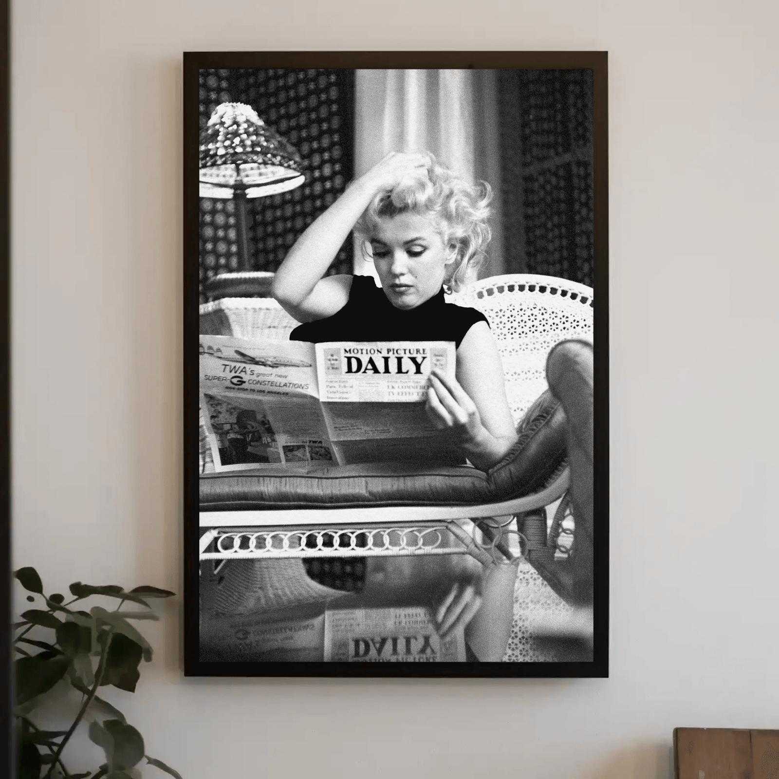 Black and white photo poster of world famous Hollywood icon, actress and model Marilyn Monroe reading a newspaper on the sofa. Iconic photograph in black and white of Marilyn Monroe sitting in a sofa reading a newspaper. Perfect for adding a touch of old-world luxury to any interior, this piece complements both modern and retro-inspired spaces ideal for bedrooms, dressing rooms, or statement gallery walls.