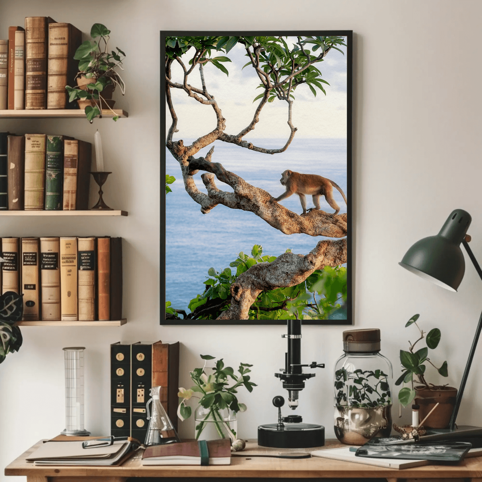 A serene nature print capturing a monkey gracefully walking along a sunlit tree branch above the ocean. The soft blues of the sea meet lush green foliage, creating a peaceful tropical atmosphere. A vibrant reminder of balance, freedom, and the quiet beauty of the wild.