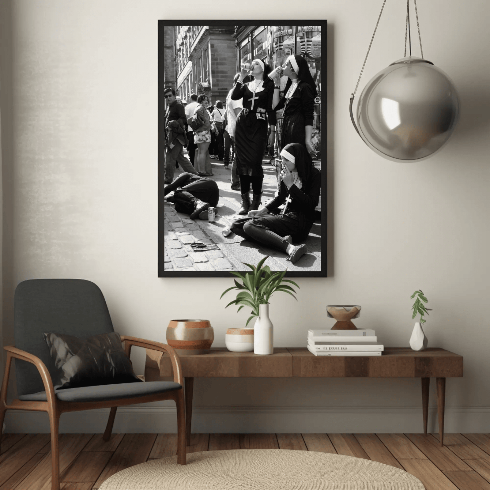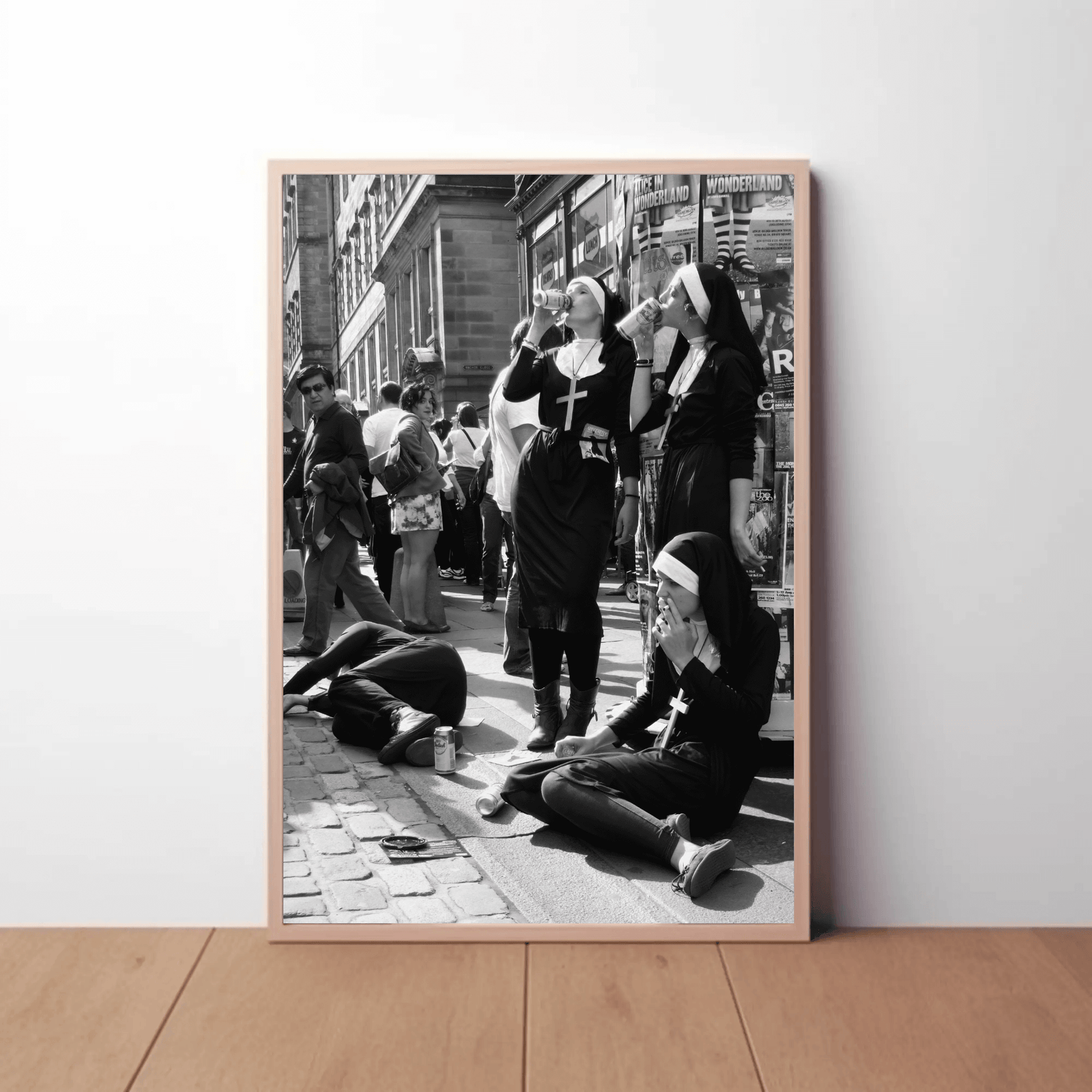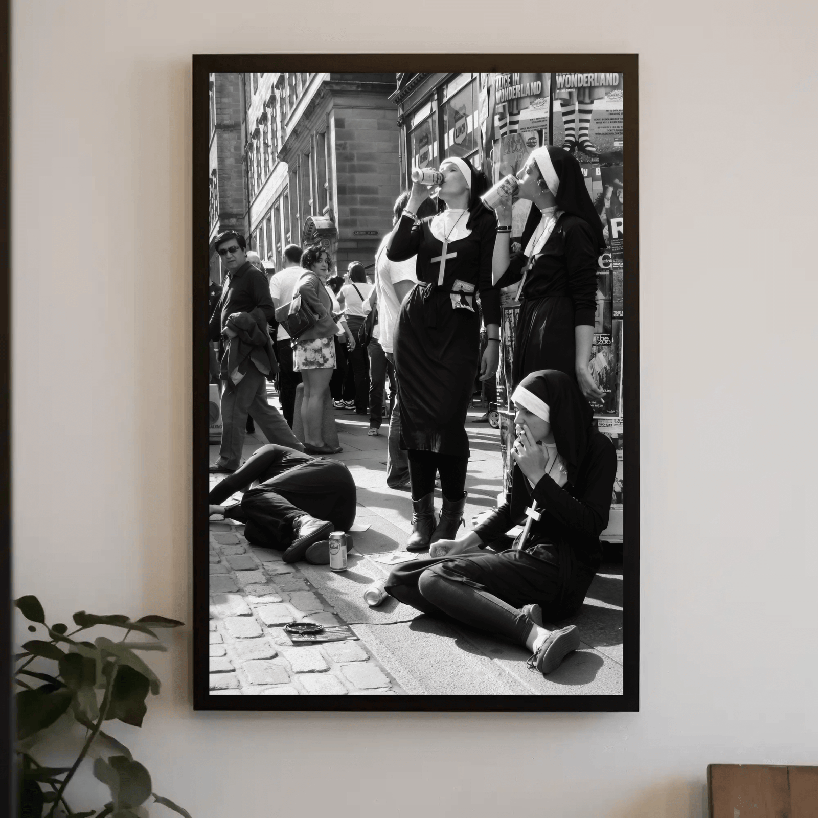 A striking black and white photograph capturing nuns enjoying a casual moment on a busy city street. With its candid composition and playful contrast between sacred and secular, this memorable image brings urban character and wit to any space. Perfect for living rooms, offices, or anyone who loves bold street photography with personality.