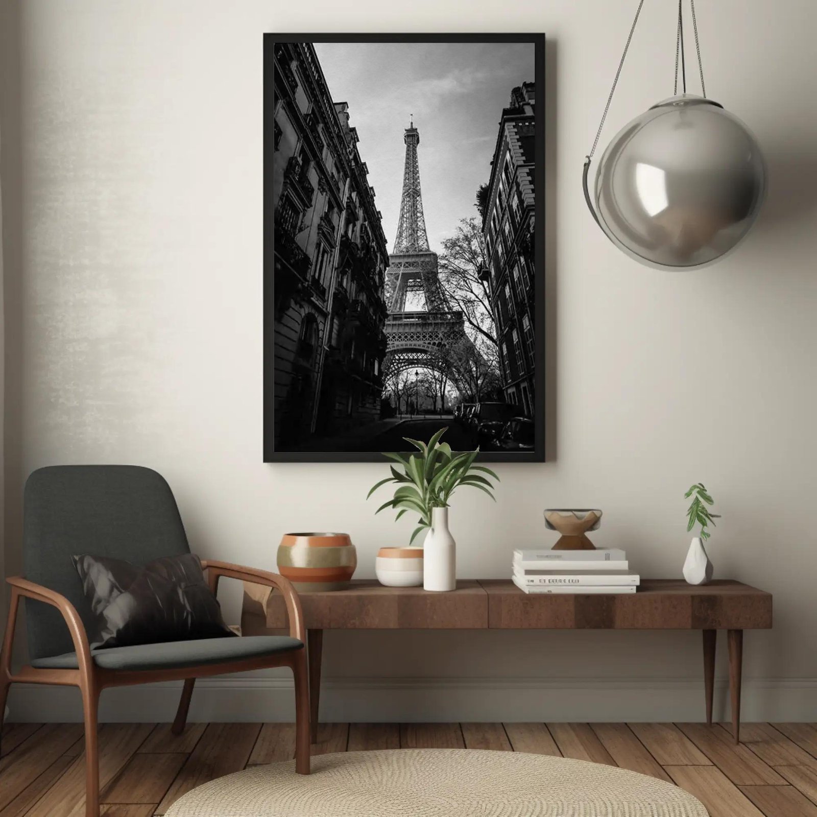 A timeless Paris street view leading toward the Eiffel Tower, captured in elegant monochrome. This fine art print brings a sense of romance, depth and European charm to any room. Perfect for modern, minimalist and design-led interiors.