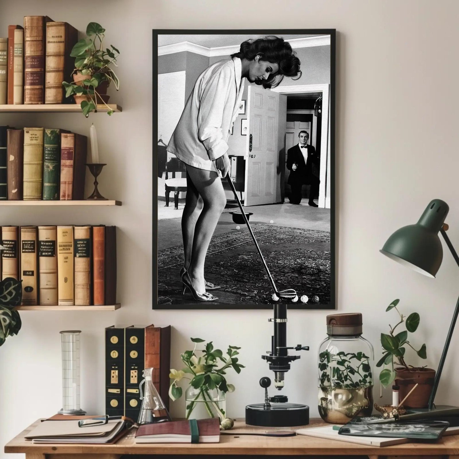 A playful black and white scene capturing Eunice Gayson practicing her putt while Sean Connery watches from the doorway. The moment feels stylish, intimate, and effortlessly cool. Perfect for adding vintage charm and personality to any room. Ideal wall art for fans of classic cinema, retro photography, and timeless home décor.