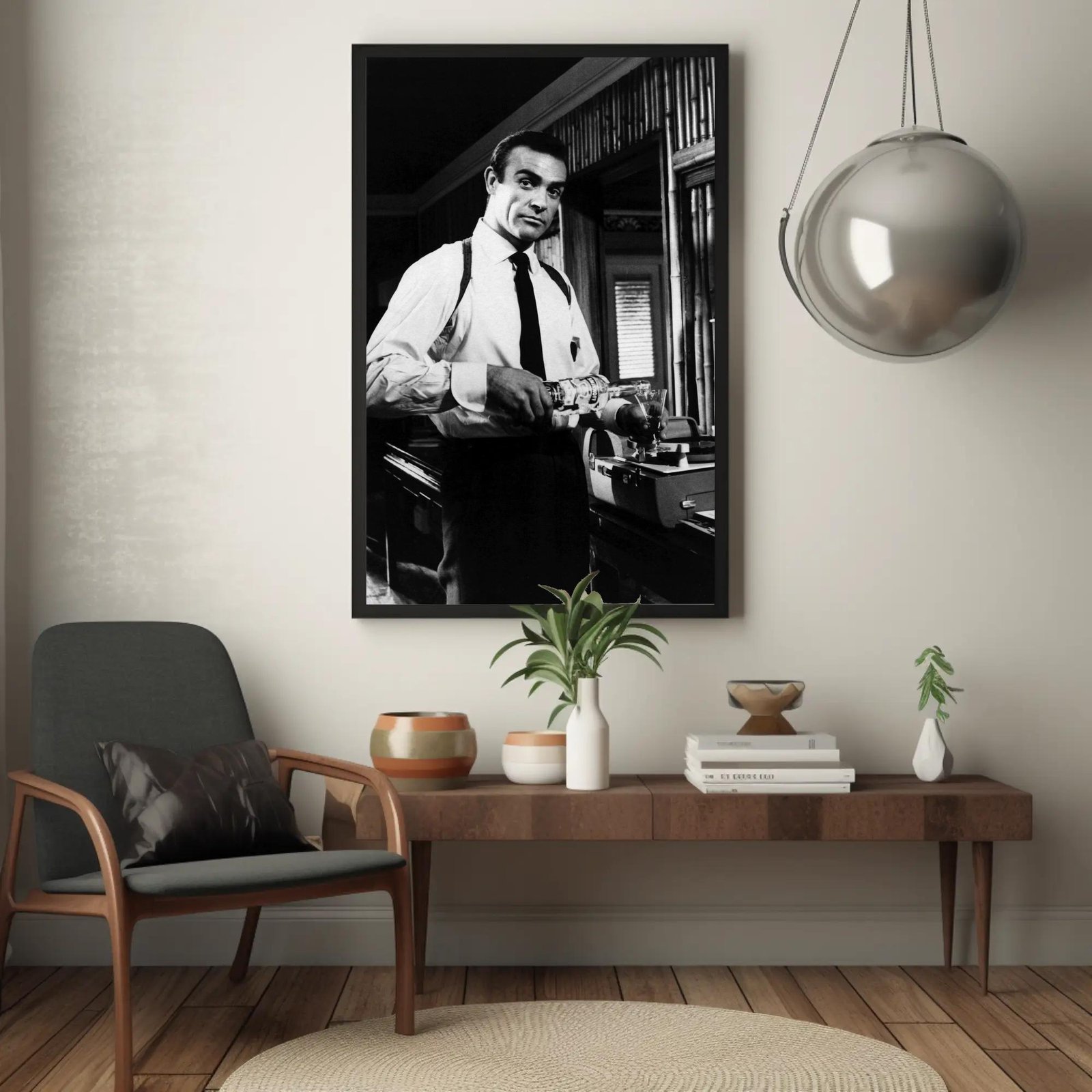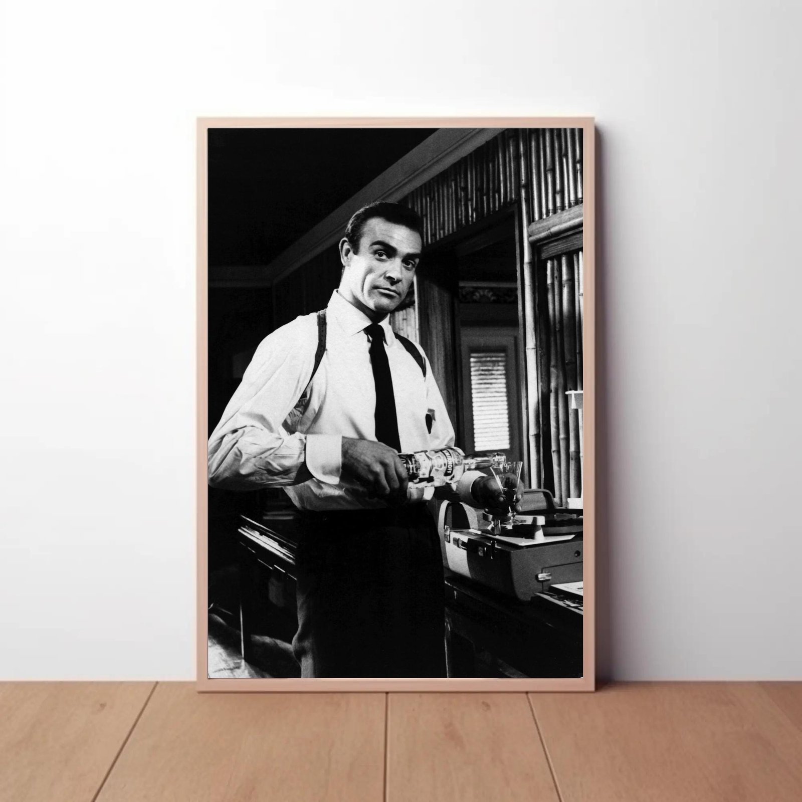 A striking black and white photograph capturing a dapper Sean Connery in suspenders and tie at a vintage bar setting. With classic 1960s style, dramatic lighting, and timeless sophistication, this elegant image evokes the golden age of cinema and cocktail culture. Perfect for home bars, man caves, or anyone who loves vintage film photography and retro elegance.