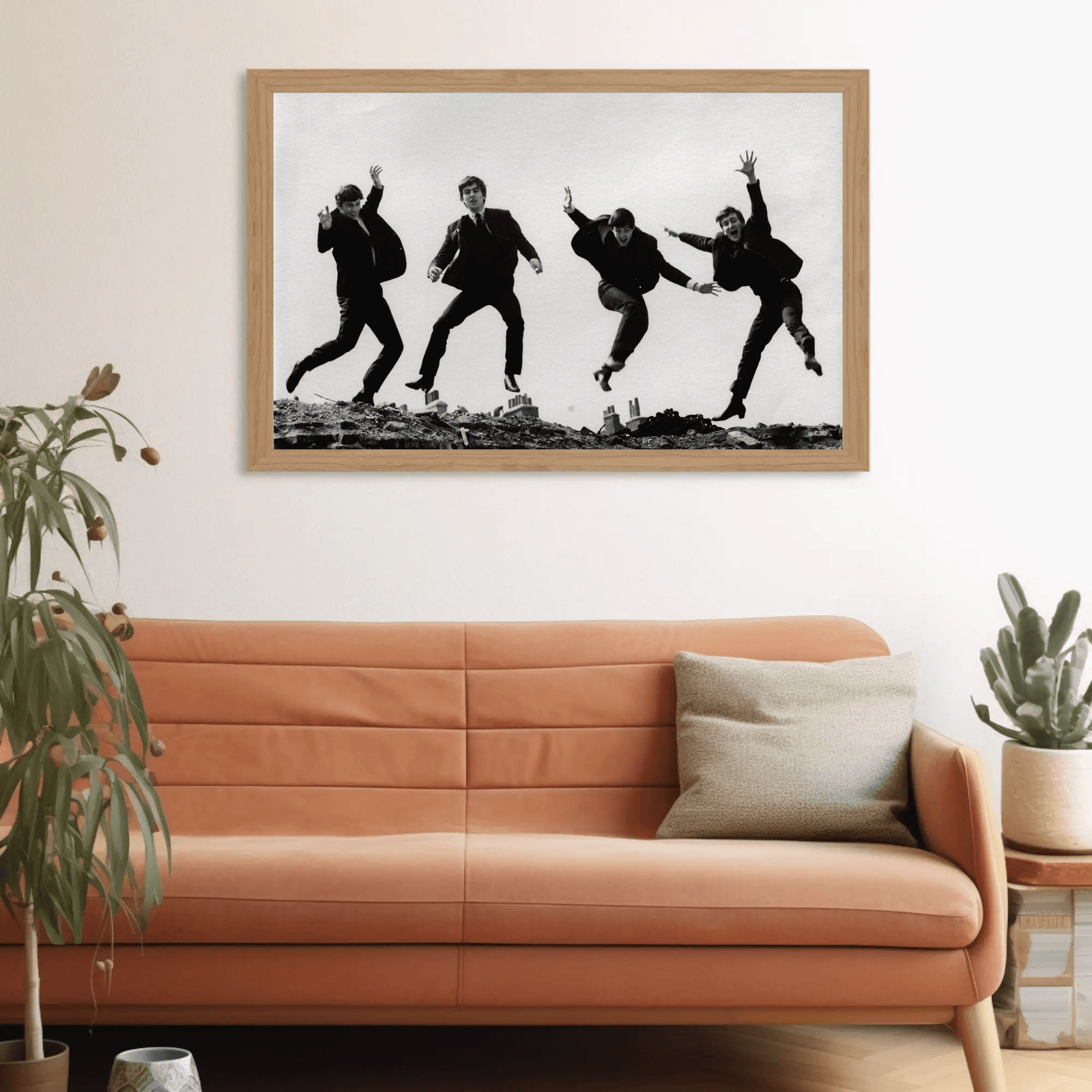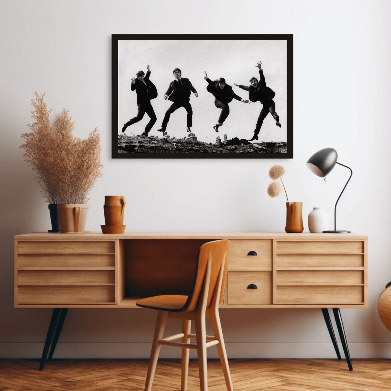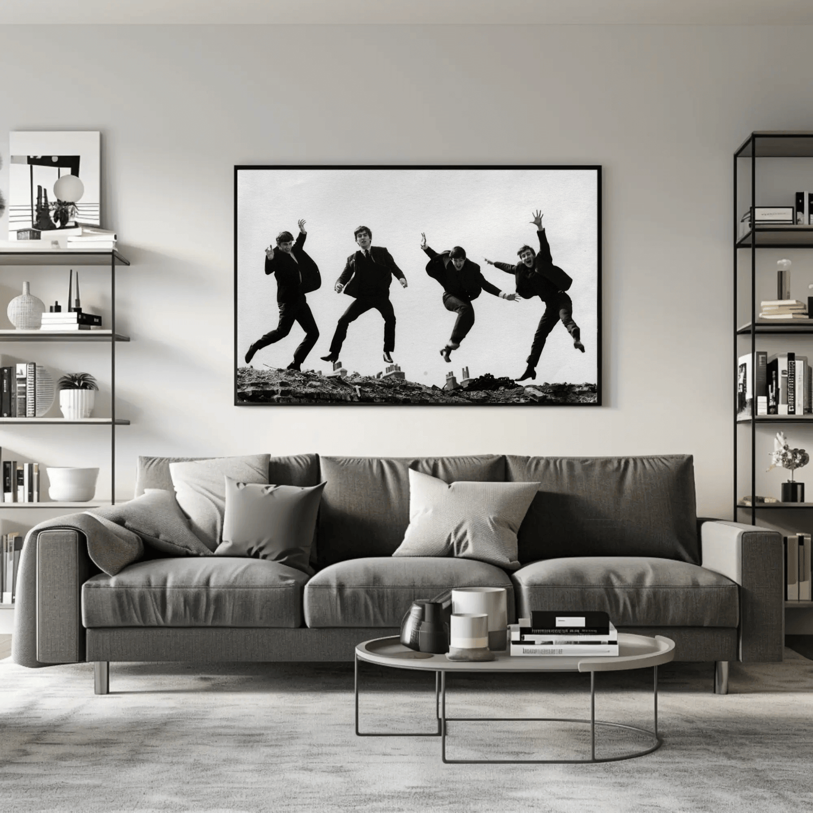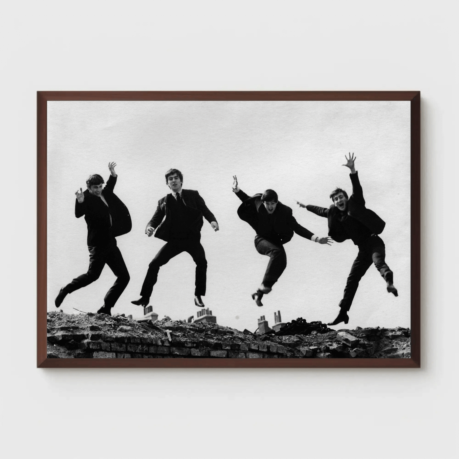 A lively black and white photograph capturing The Beatles mid-jump, full of energy and charisma. Set against a simple city backdrop, the image reflects the spirit and spontaneity of the 1960s, showcasing the band’s playful charm and cultural influence. A perfect piece for music lovers and fans of classic rock history.