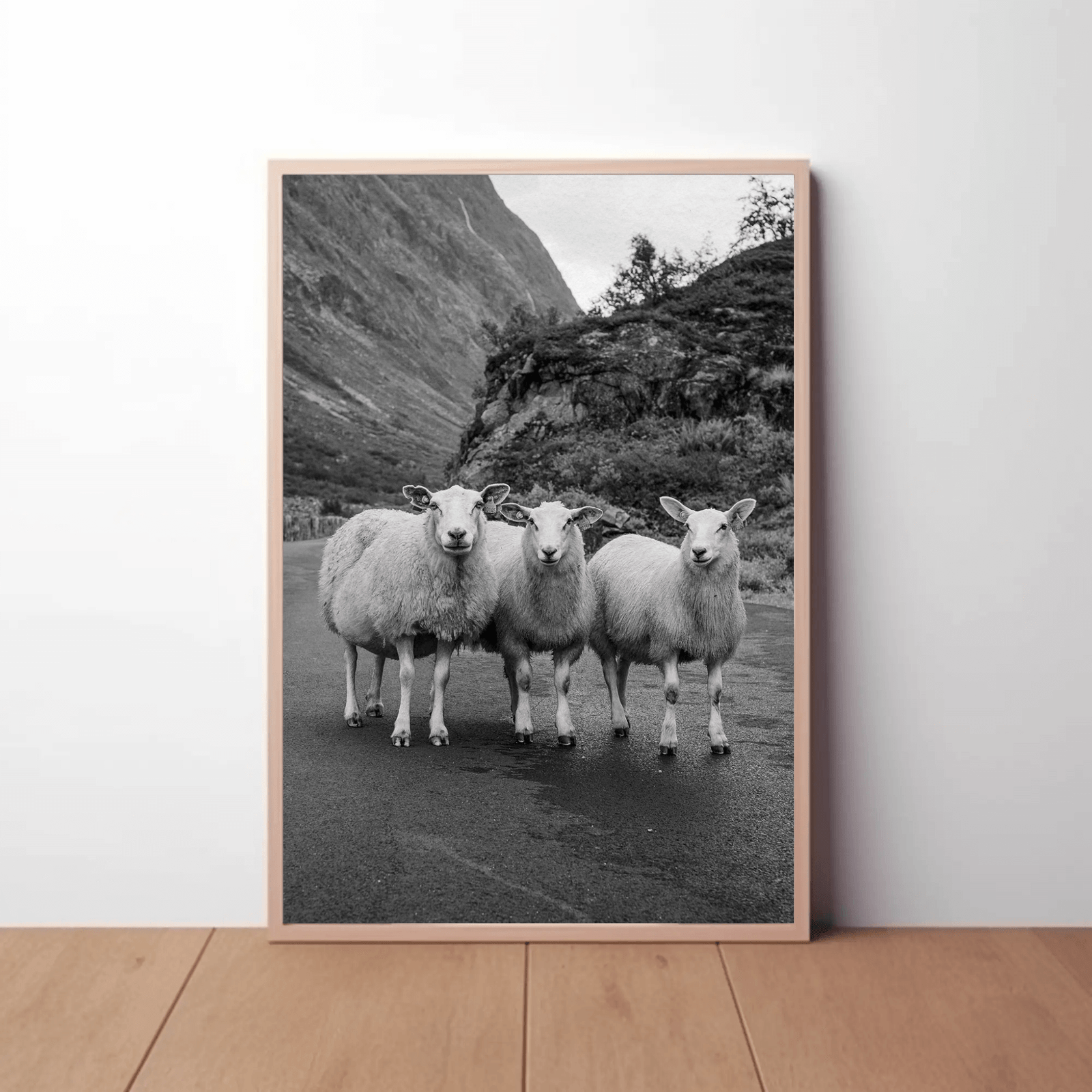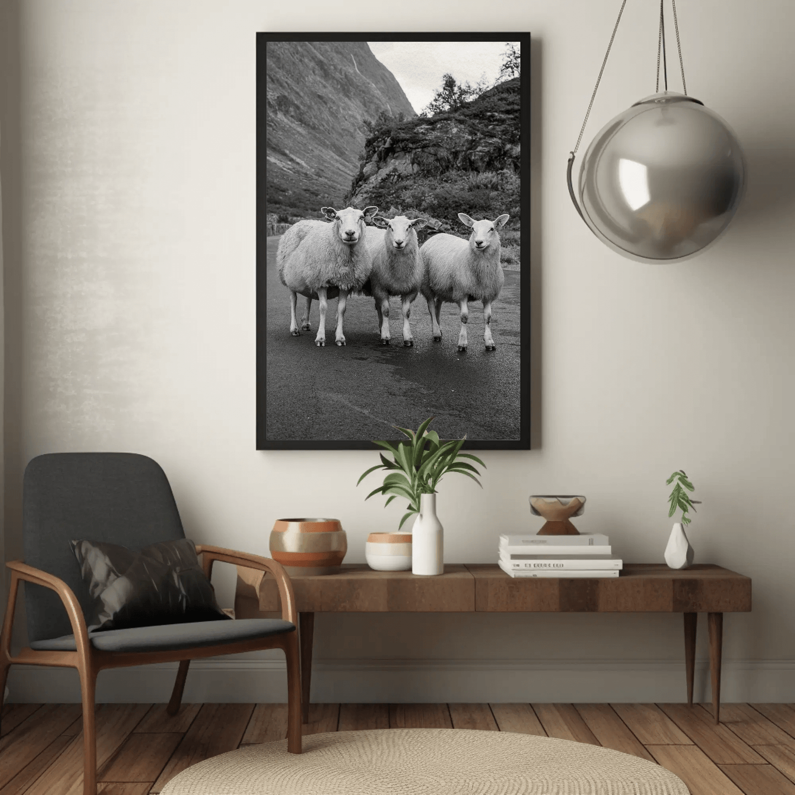 A refined black-and-white art print featuring three sheep poised against a dramatic mountain backdrop. Minimalist yet captivating, it evokes the quiet poetry of nature and rural serenity. A cinematic balance of texture, light, and composition that radiates calm sophistication. Perfect for interiors embracing modern simplicity and timeless natural elegance.