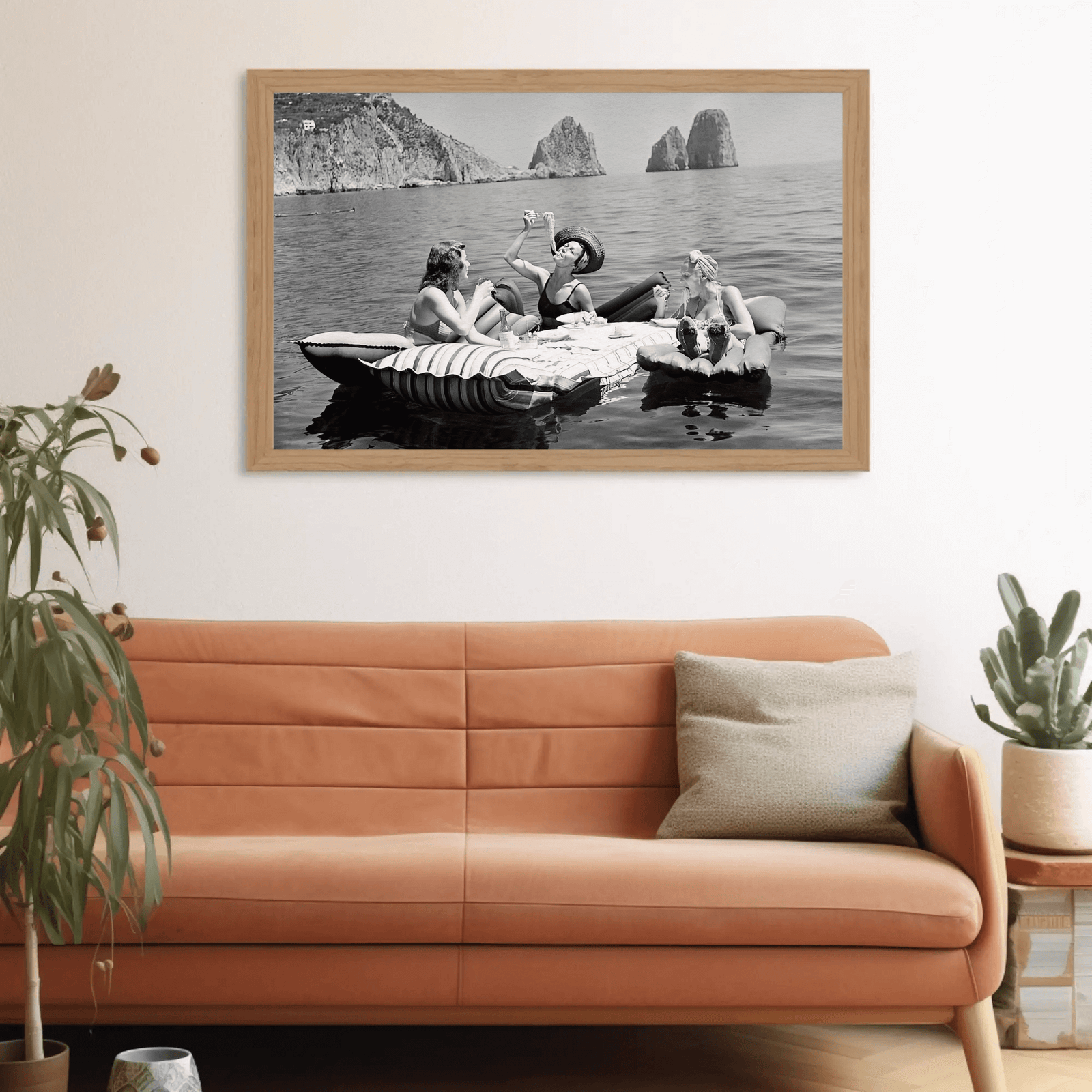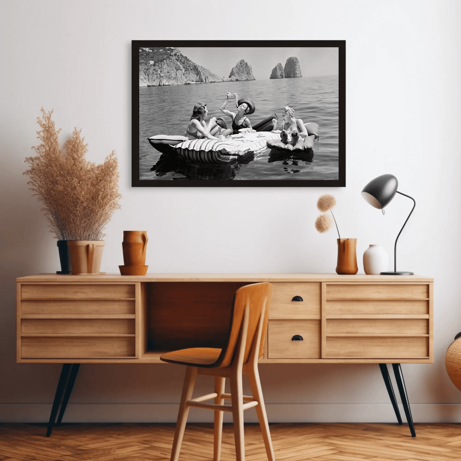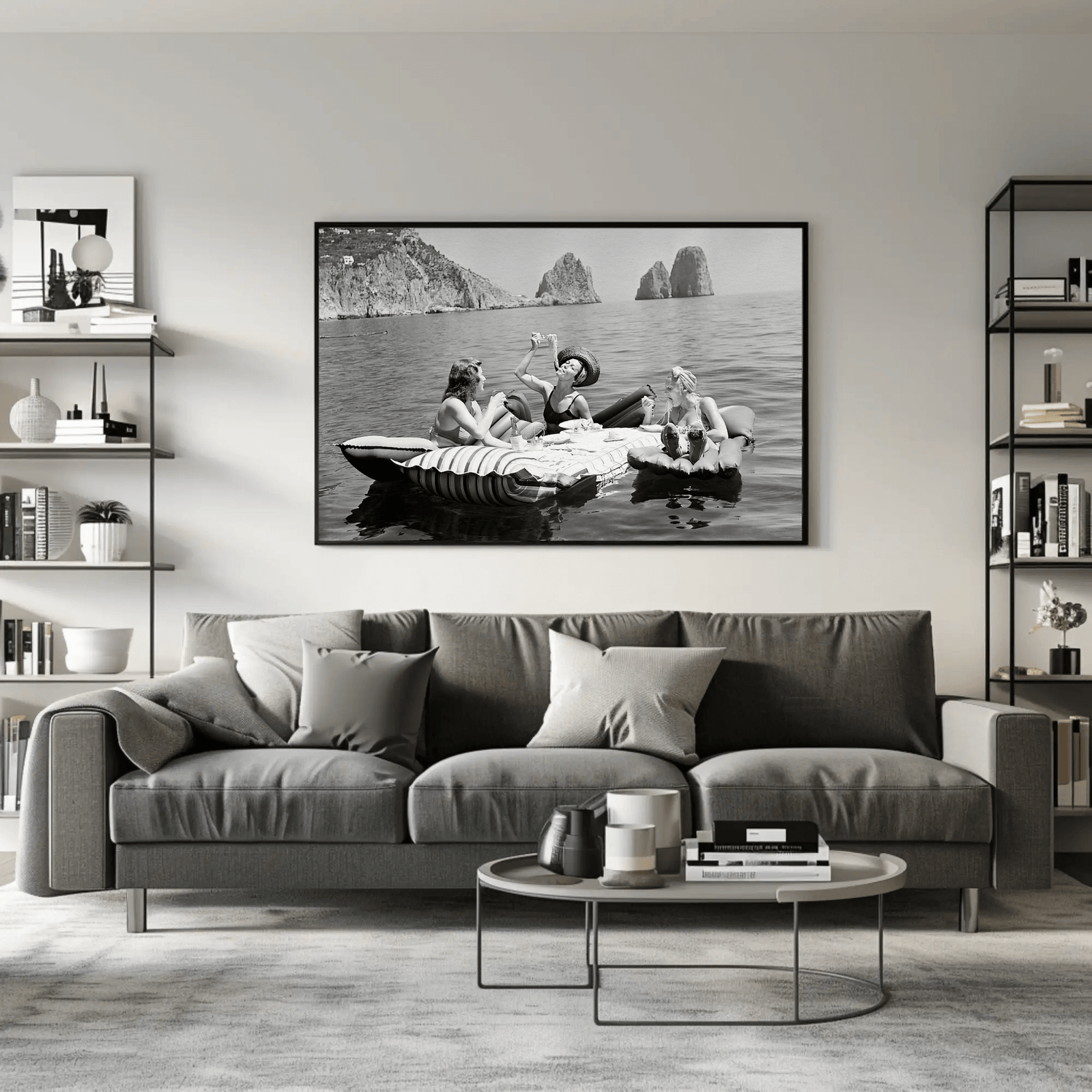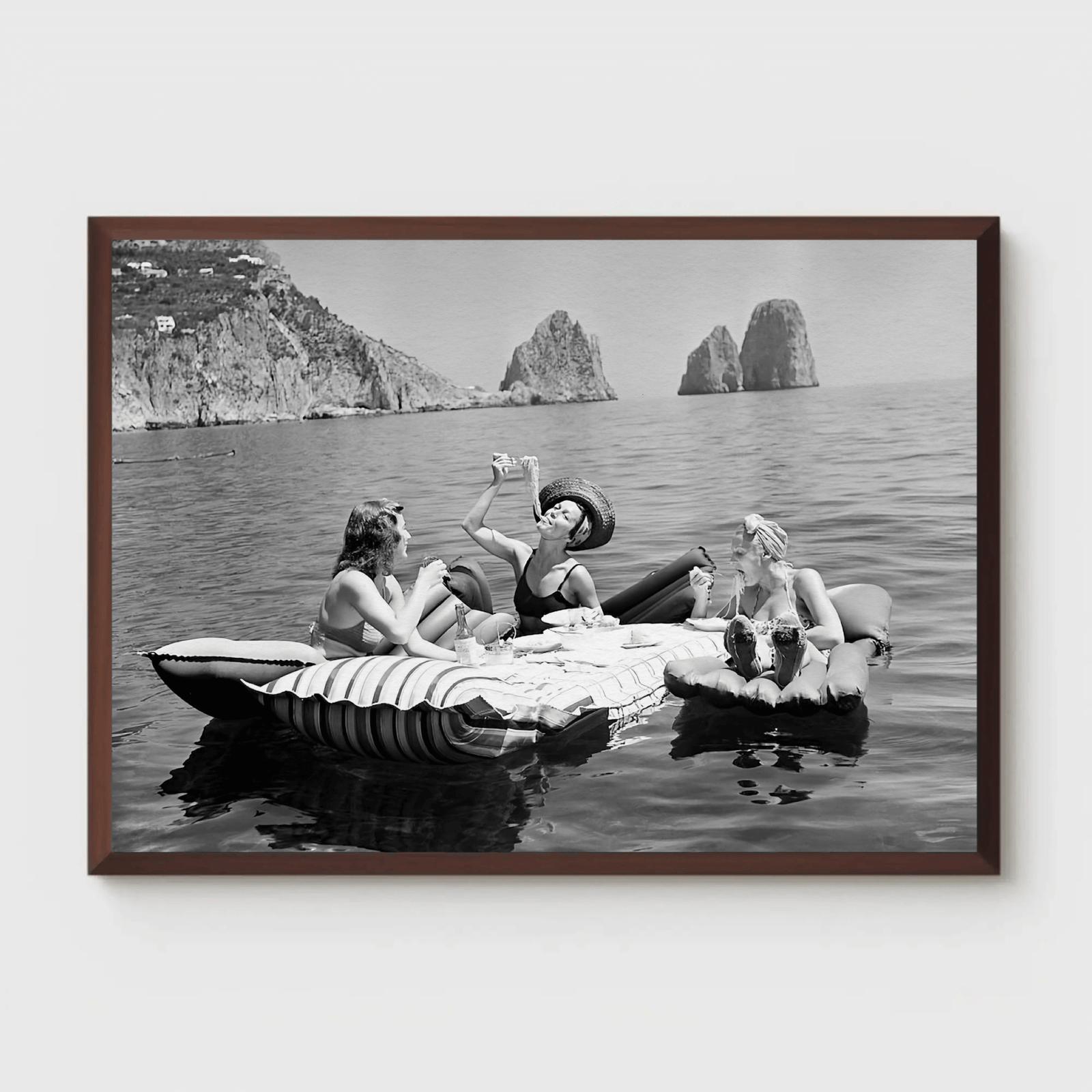A captivating black and white photograph capturing three women adrift on calm waters, indulging in an effortless seaside luncheon. The serene horizon and timeless fashion exude sophistication and leisure, evoking an era of carefree glamour. Perfect for interiors seeking a touch of vintage elegance and coastal allure.